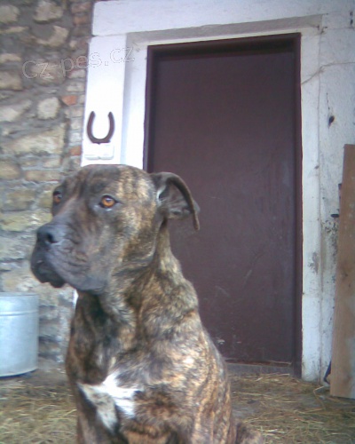 Maminka je čistokrevný bandog bez PP, vysoká asi jako německý ovčák, ale o něco kratší. Má však také obdélníkovou figuru, ne čtvercovou, jako například dobrman (viz. 2.foto barevně žíhané feny).