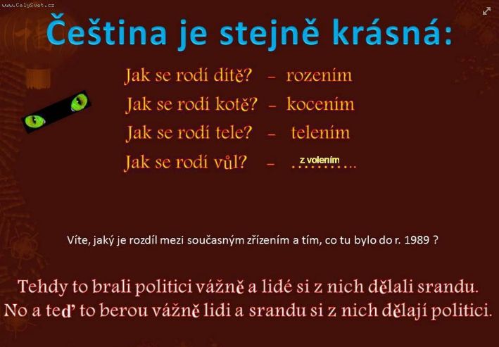 A k ty cestine, ja ji miluju. Jedna studentka me rozsekala nedavno, neumela vytvorit podstatny jmeno od slovesa "vlastnit". Kdo, co vlastní? Vlast!!!! A mela recht de facto.